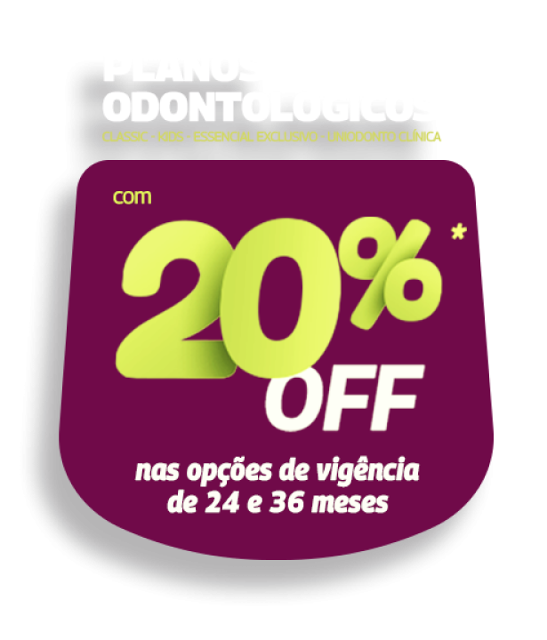 *Promoção válida de 1 de dezembro a 31 de dezembro de 2025 para contratação do plano da Uniodonto de São José dos Campos para Pessoa Jurídica (Essencial Exclusivo Corporativo e Plano Uniodonto Clínica Empresarial), com opções de vigência de 24 e 36 meses a partir de 3 vidas e pagamento em boleto digital sem carência e para contratação dos planos para Pessoa Física: (Classic, Kids, Essencial Exclusivo e Clínica), com opções de vigência de 24 e 36 meses e pagamento das mensalidades com cartão de crédito, débito, pagamento a vista , sem carência e boleto digital com carência de 60 dias. Os valores/condições são divulgados em face da legislação vigente, que possibilita às cooperativas e operadoras de planos de saúde a divulgação dos preços de seus produtos (Leis nºs 5.764/71, 9.656/98 e 9.961/00). Os valores/condições consignados não tem correlação com aqueles recebidos pelos dentistas.