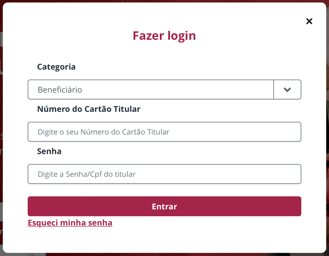 Em seu primeiro acesso, escolha a categoria Beneficiário no primeiro campo.No campo Número do Cartão Titular.