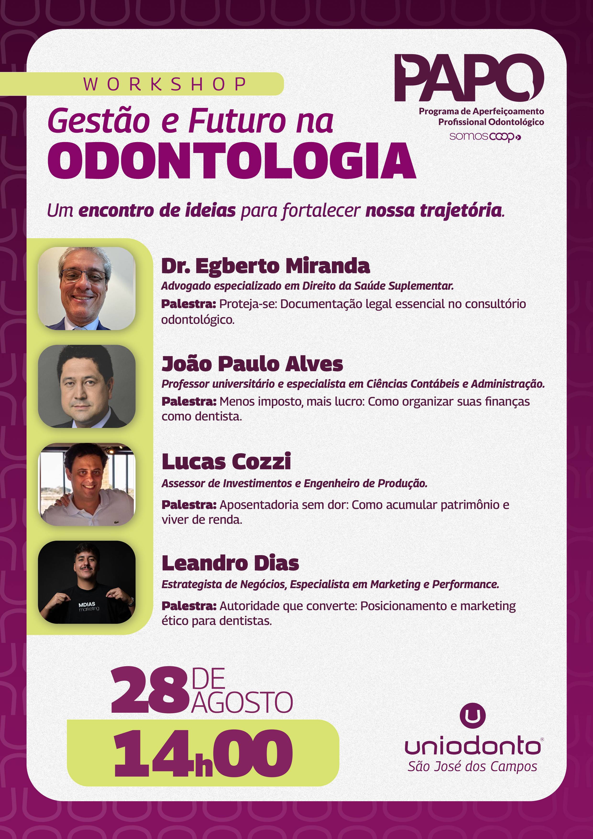 O PAPO Uniodonto, oferece palestras e cursos de atualização gratuitos, possibilitando o constante aperfeiçoamento dos nossos dentistas cooperados, contribuindo para o elevado nível dos tratamentos realizados.